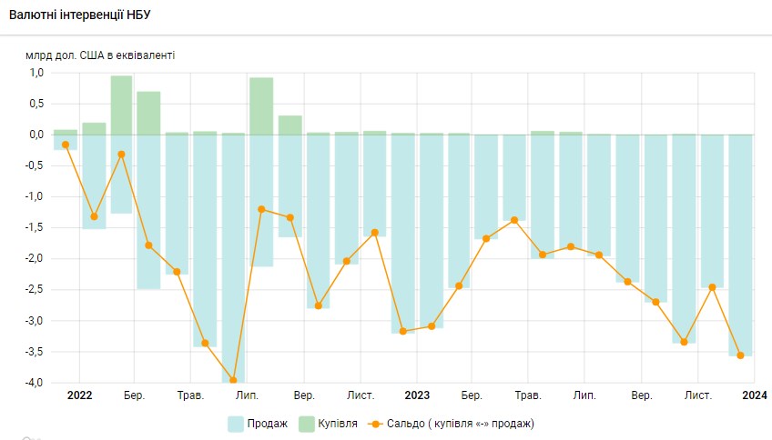 Національний банк України (НБУ) в грудні 2023 року продав на міжбанківському валютному ринку 3,553 млрд доларів.