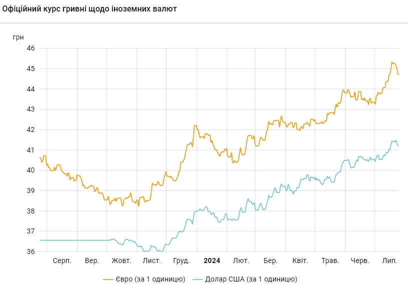 Офіційний курс на 25 липня 2024 року встановлено на такому рівні: 41,2174 грн за 1 долар (-0,0142 грн).