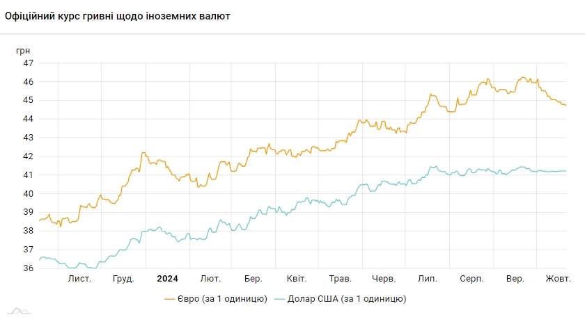 Українські банкіри у жовтні 2024 року очікують на курс через 12 місяців на рівні 44,92 грн/долар. Це вище за попередній прогноз за липень на рівні 43,15 грн/долар.