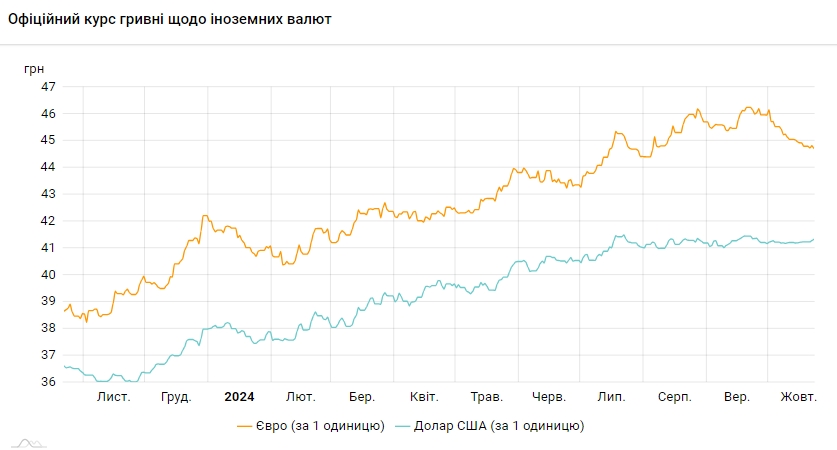 Офіційний курс на 23 жовтня 2024 року встановлено на такому рівні: 41,3313 грн за 1 долар (+0,0480 грн).