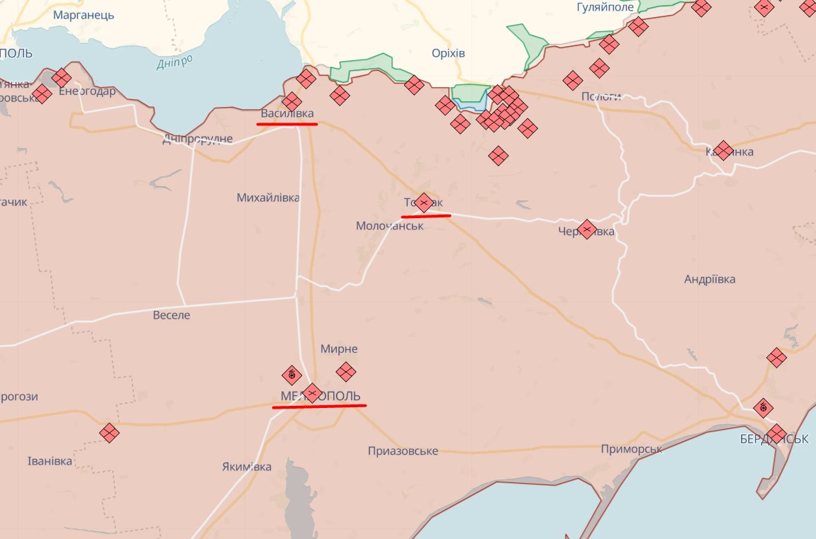 Фото: трикутник Василівка-Токмак-Мелітополь закриває сухопутний коридор РФ на півдні України (deepstatemap.live)