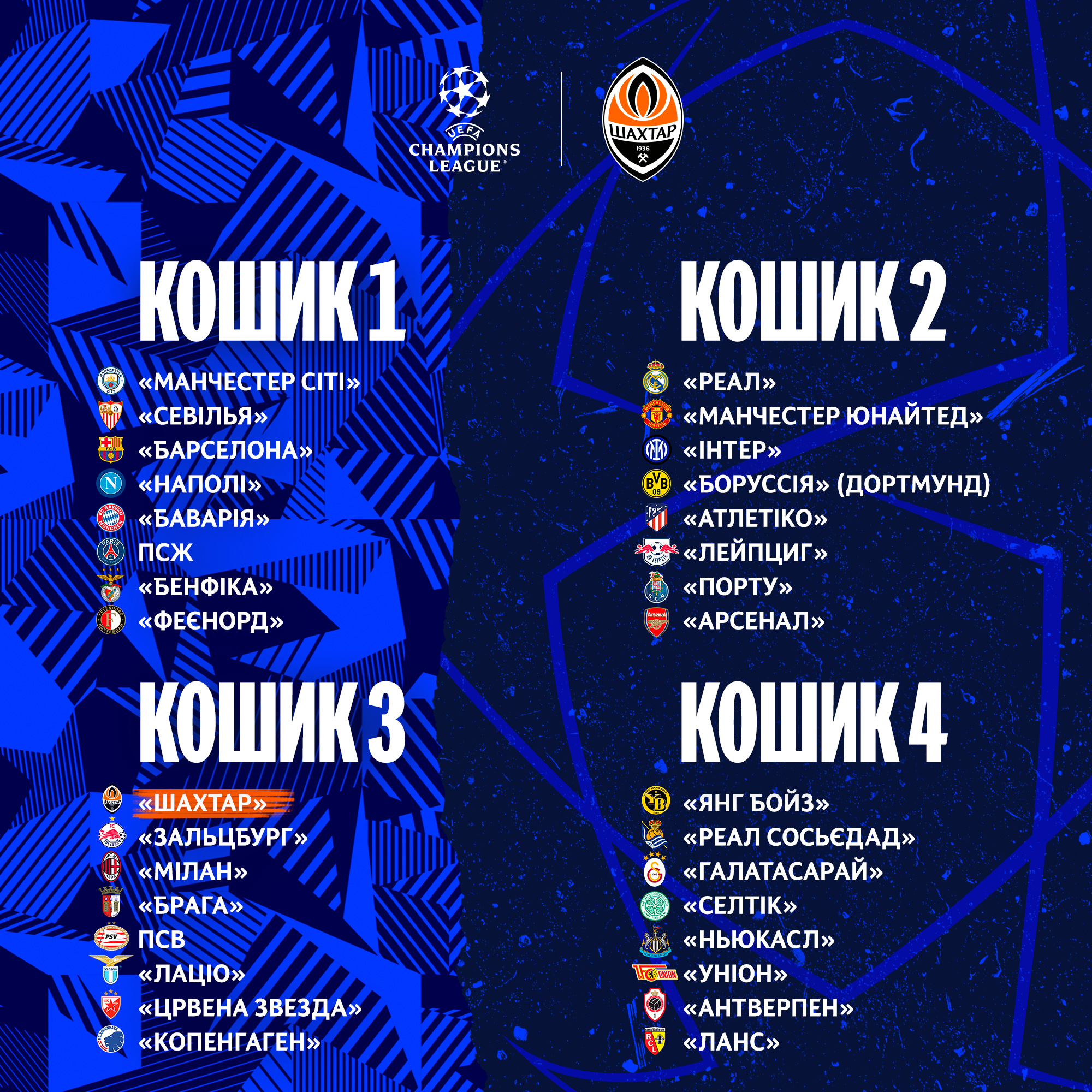 До третього кошика потрапив єдиний представник України в Лізі чемпіонів. "Шахтар" на груповому етапі точно не зустрінеться з данським "Копенгагеном", нідерландським ПСВ, белградською "Црвеною Звездою", римським "Лаціо", португальською "Брагою", італійським "Міланом" і австрійським "Зальцбургом". До групи не зможуть потрапити клуби з однієї країни.