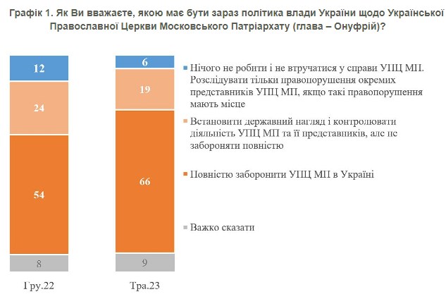 Крім того, з 54% до 66% стало більше тих, хто вважає, що ця церква має бути повністю забороненою в Україні. Ще 19% виступають за дещо м’якший підхід, що не передбачає повної заборони, але передбачає встановлення державного контролю та нагляду (у грудні 2022 року - 24%).