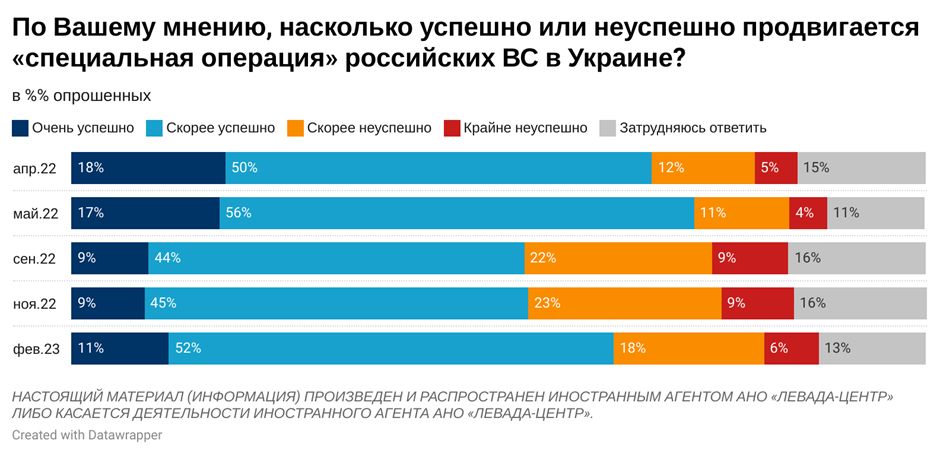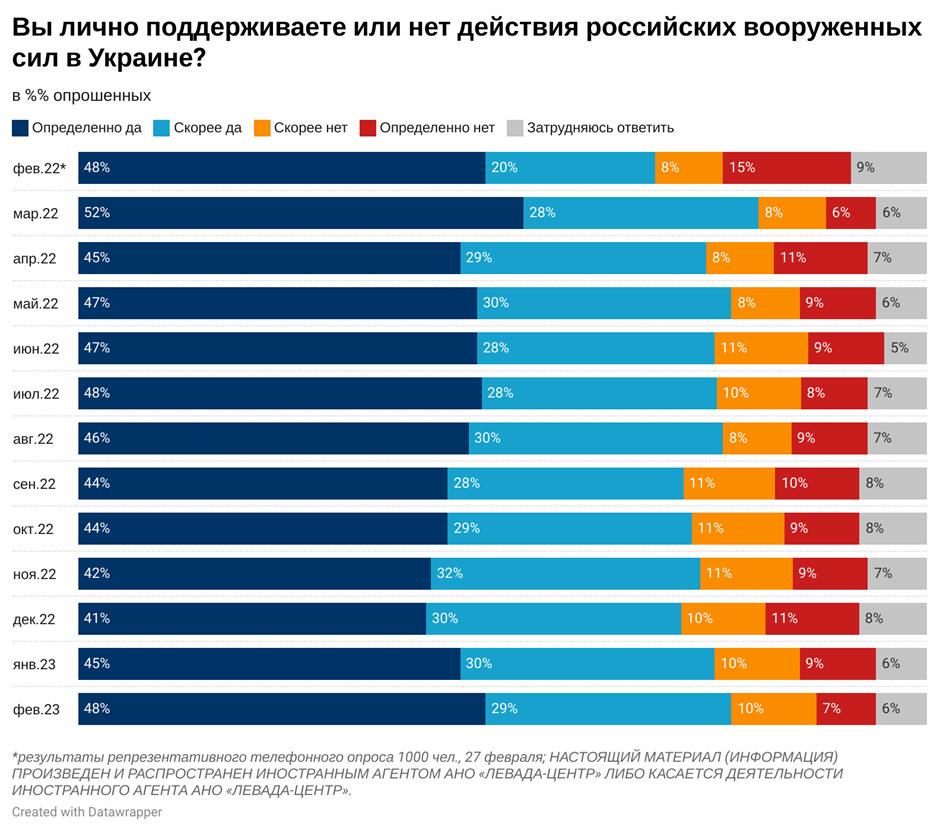 Наприкінці лютого 2023 року 77% підтримують "дії російських збройних сил в Україні" (рік тому - 68%), не підтримують - 17% (рік тому - 23%).