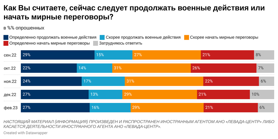Прихильників мирних переговорів у суспільстві, як і раніше, трохи більше, ніж прихильників продовження військових дій (50% проти 43%). Проте частка прихильників продовження плавно зростала з жовтня минулого року, у міру того, як відбувався шок від оголошення мобілізації, зазначають соціологи.