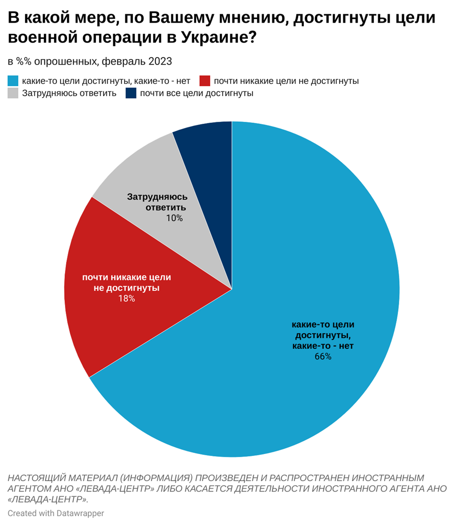 При цьому 6% респондентів вважають, що майже всіх цілей "військової операції" досягнуто, 66% - що "якихось цілей досягнуто, якихось - ні", ще 18% вважають, що "майже ніяких цілей не досягнуто".
