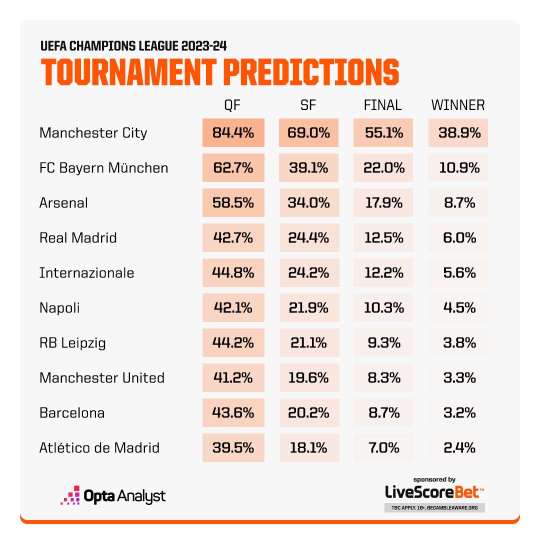 Провідні спортивні аналітики з компанії Opta за допомогою штучного інтелекту визначили головних претендентів на тріумф у Лізі чемпіонів 2023/24. Лідер рейтингу – англійський "Манчестер Сіті".