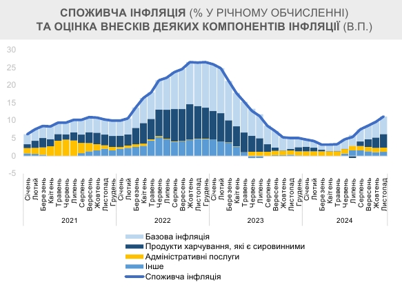 "Загалом споживча інфляція, попри прискорення цінової динаміки в листопаді є відносно невисокою як для країни, яка наразі перебуває в активній фазі війни з РФ на своїй території", - йдеться в огляді.