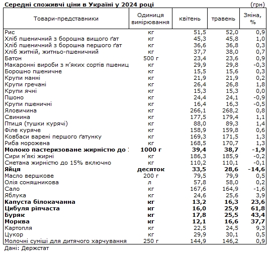 За даними статистичного відомства, у травні 2024 року середні ціни на яйця впали на 14,6% - до 28,6 гривень за десяток, молоко подешевшало на 1,9% - до 38,7 гривень за літр.