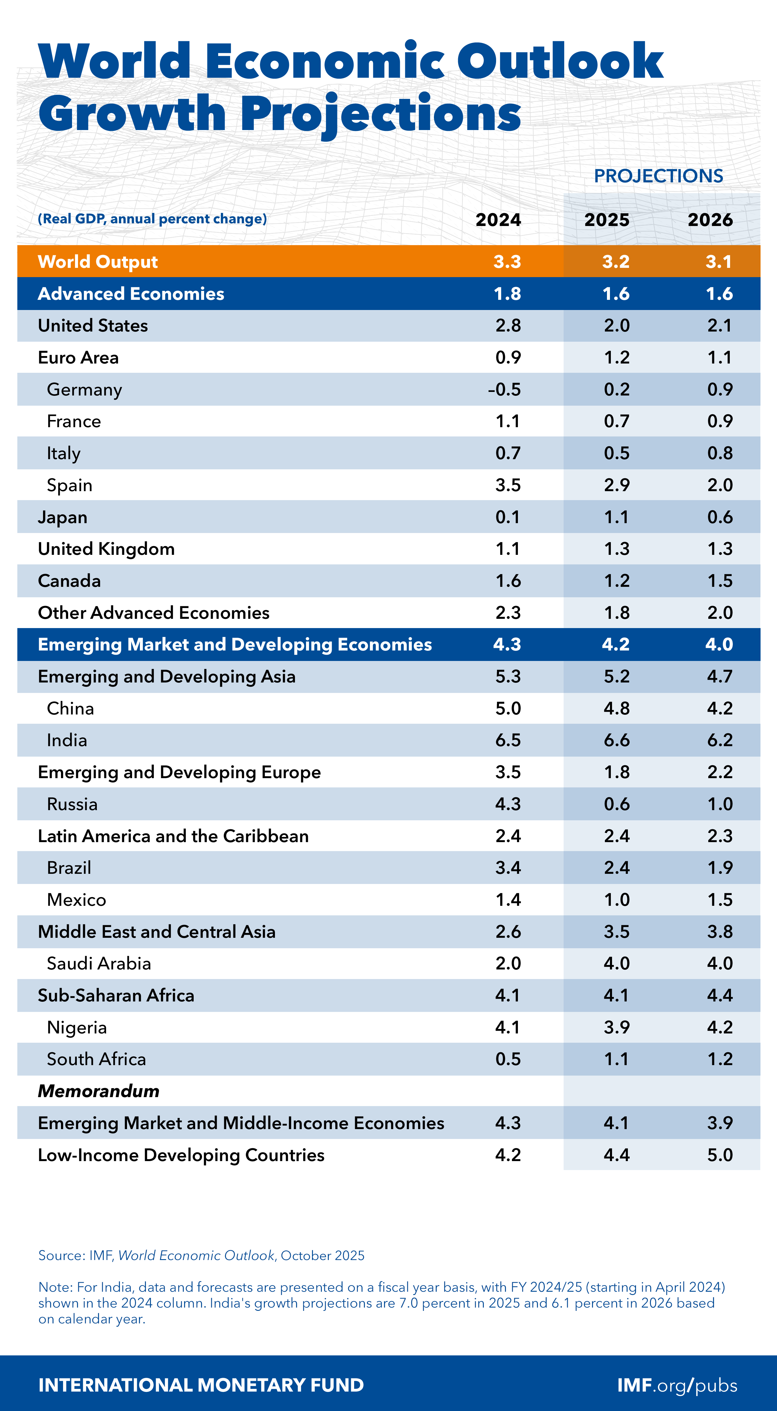 За прогнозом МВФ, темпи глобального зростання знизяться з 3,3% у 2024 році до 3,2% у 2025-му і 3,1% у 2026-му. Розвинені економіки зростуть приблизно на 1,5%, а ті, що розвиваються, і країни з ринками, що формуються, - трохи вище 4%.
