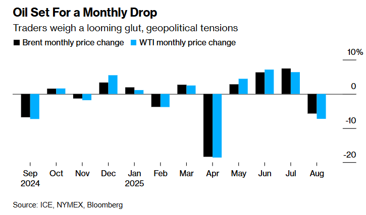 Серпень став першим місяцем падіння цін на нафту з квітня. Основні причини - геополітика та очікування надлишку пропозиції.