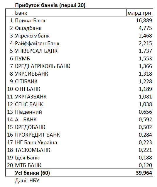 Рейтинг за прибутковістю, як і раніше, очолює державний ПриватБанк, який заробив 16,889 млрд гривень.