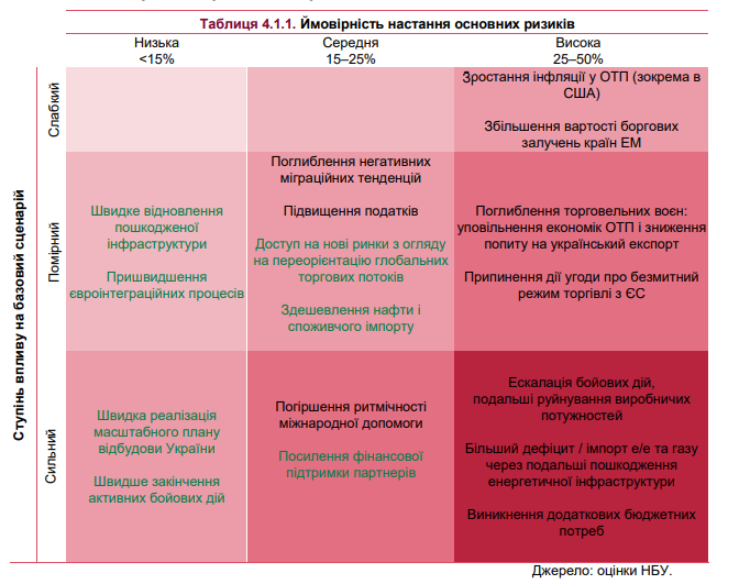 "Водночас зберігається і позитивний ризик щодо відносно швидкого досягнення справедливого миру для України зусиллями міжнародної спільноти, що суттєво поліпшить перспективи відновлення економіки", - йдеться в документі НБУ.