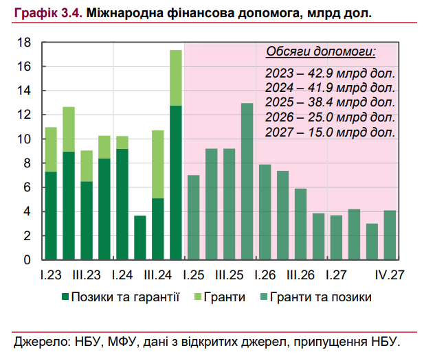 Прогнозом передбачається залучення міжнародного фінансування в розмірі 38,4 млрд доларів у 2025 році, 25 млрд доларів у 2026 році та 15 млрд доларів у 2027 році.