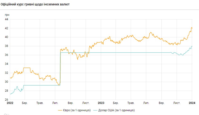 Офіційний курс долара за грудень зріс на 4,4% з 36,38 до 37,98 грн/долар і майже щодня оновлював рекорди. Курс виріс через рекордний дефіцит валюти. НБУ у грудні 2023 року продав на міжбанківському валютному ринку 3,553 млрд доларів. Це максимальний обсяг із червня 2022 року.