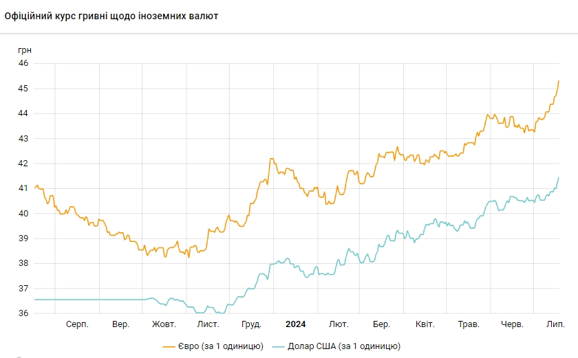 Курс євро становитиме 45,3457 гривень за 1 євро (+0,3668 грн). До цього максимум був 17 липня – 44,9789.