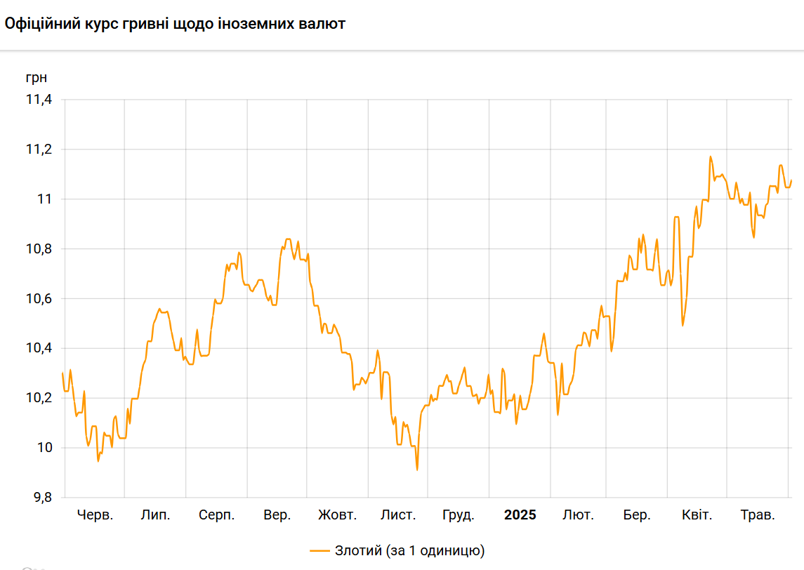 Офіційний курс на 2 червня 2025 року встановлено на такому рівні: 11,0795 гривень за 1 злотий (0,0306 грн).