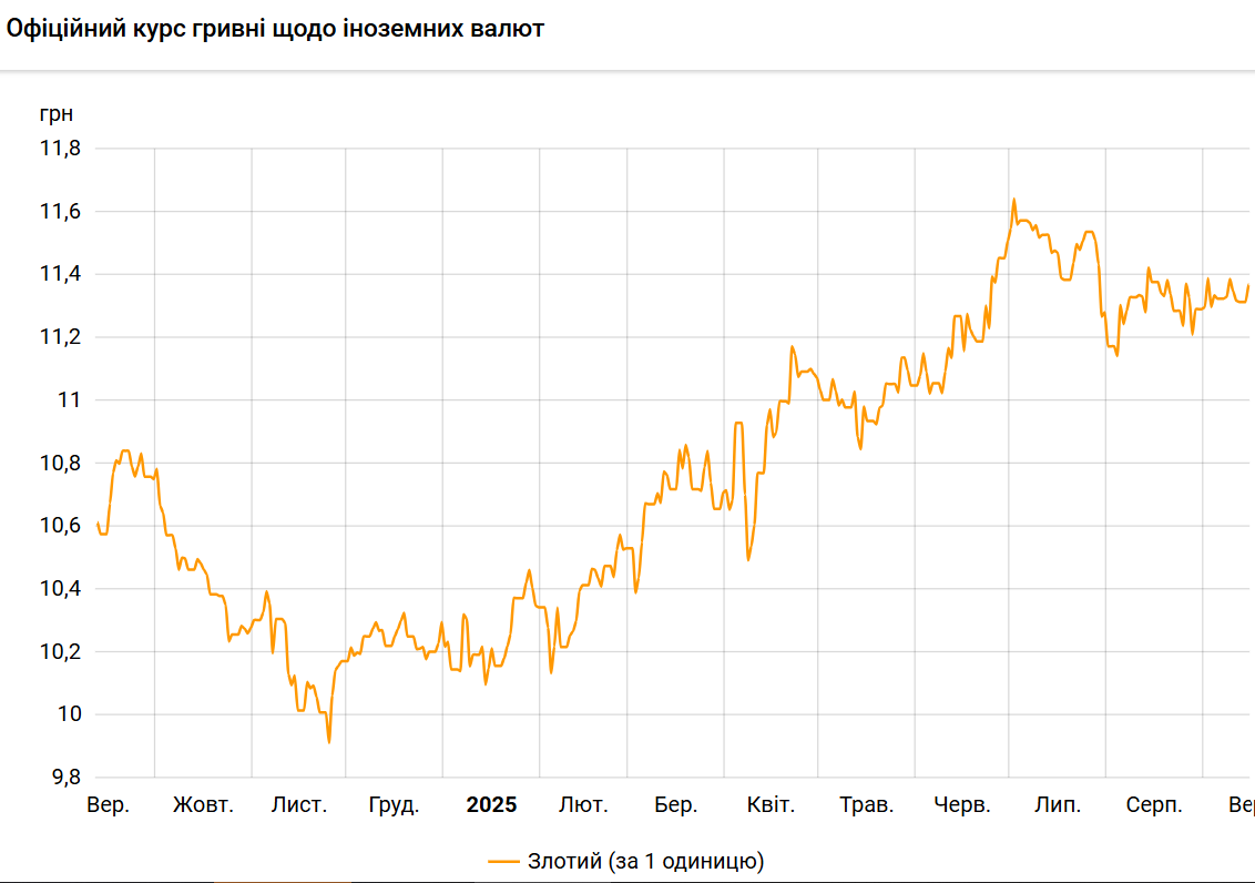 Офіційний курс на 15 вересня 2025 року встановлено на такому рівні: 11,3704 гривень за 1 злотий (+0,0559 грн).