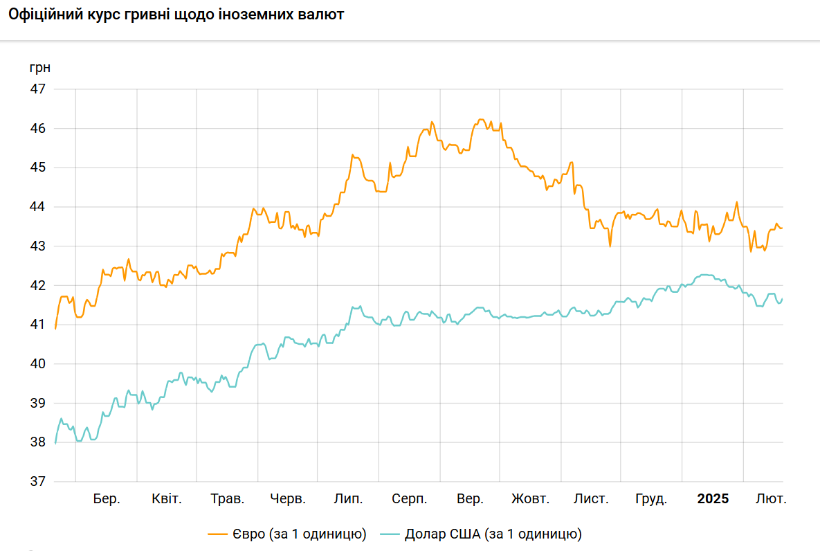 Офіційний курс на 20 лютого 2025 року встановлено на такому рівні: 41,6814 гривень за 1 долар (+0,1109 грн).