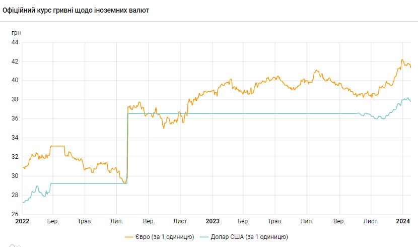 Кабінет міністрів у бюджеті на 2024 рік заклав середній курс на рівні 40,7 грн/долар, до кінця 2024 року курс очікується на рівні 42,1 грн/долар.