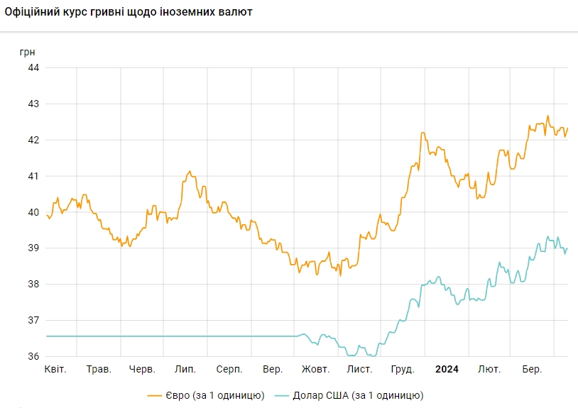 Таким чином, у березні готівковий курс долара перевищив рівень березня минулого року (38,55 грн/долар). Порівняно з груднем 2023 року курс зріс на 1,11 гривні.