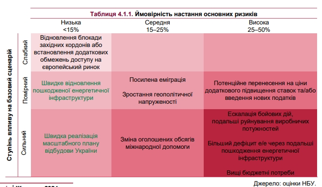 За даними НБУ, для 2024 року ризик недоотримання очікуваного фінансування є низьким, проте для наступних років він залишається вагомим, хоча й значно знизився.