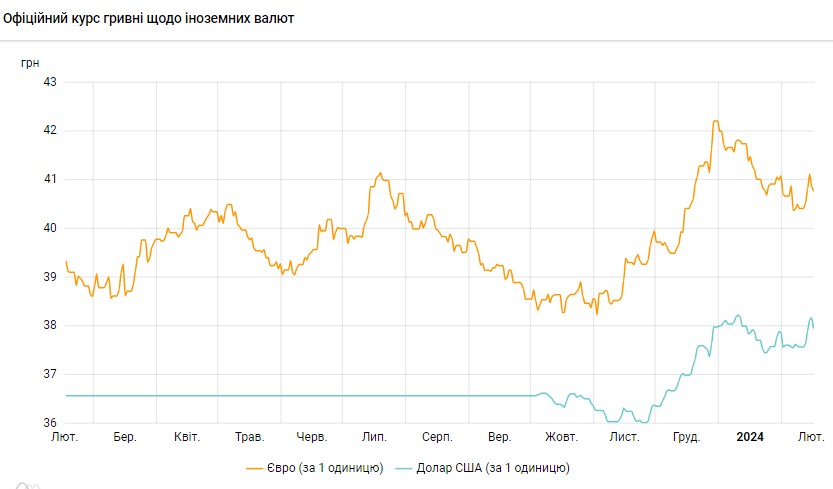 За інформацією НБУ, населення України у січні 2024 року погіршило очікування за курсом до 40,13 грн/долар порівняно із груднем (39,75 грн/долар).