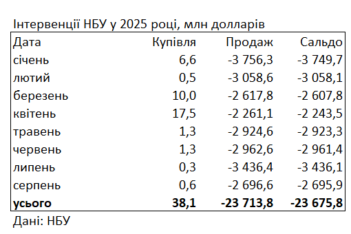 Інтервенції НБУ скоротилися після трьох місяців зростання. З початку року НБУ продав на міжбанку 23,676 млрд доларів. За цей час Україна отримала міжнародну допомогу на суму 29,5 млрд доларів, що більше, ніж інтервенції НБУ.