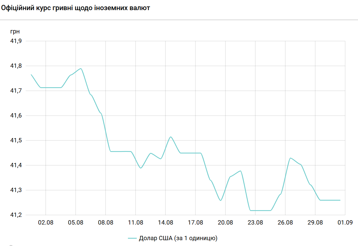 У серпні офіційний курс долара впав на 50 копійок до 41,26 гривень. Курс залишається нижчим, ніж наприкінці минулого року (42,03 грн/долар).