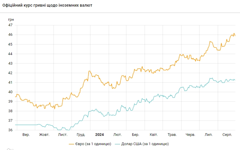 Офіційний курс на 29 серпня 2024 року встановлено на такому рівні: 41,2508 грн за 1 долар (-0,0500 грн).