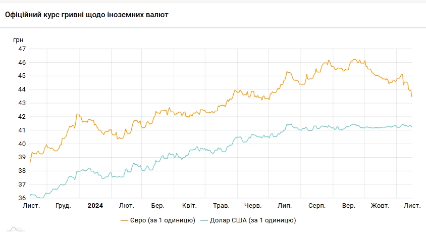 Офіційний курс на 15 листопада 2024 року встановлено на такому рівні: 41,2446 грн за 1 долар (-0,0967 грн).