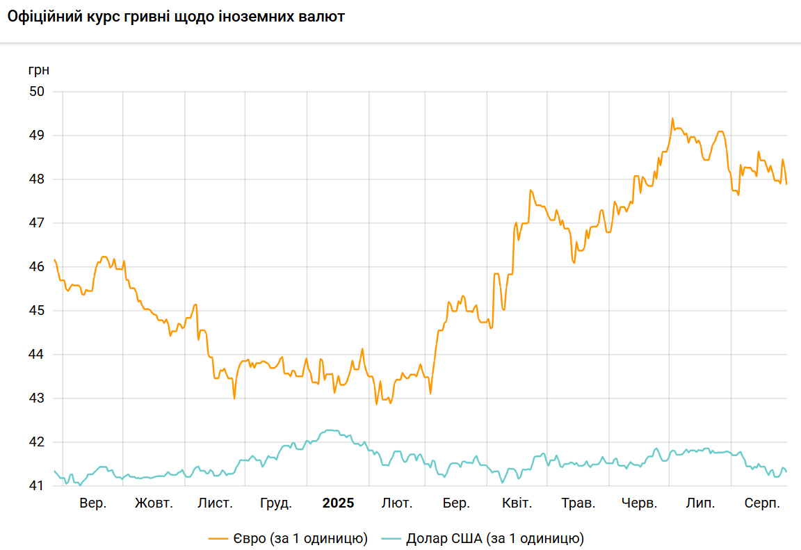 Офіційний курс на 28 серпня 2025 року встановлено на такому рівні: 41,3222 гривень за 1 долар (-0,0825 грн).