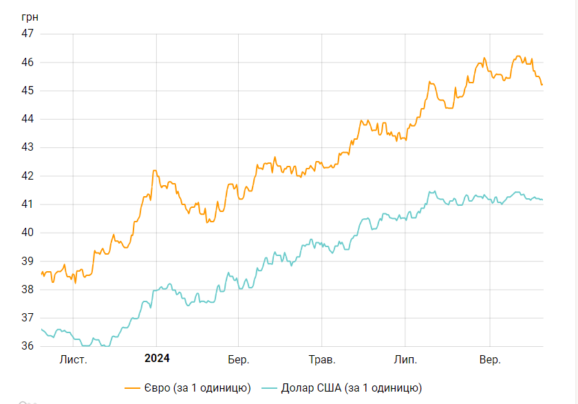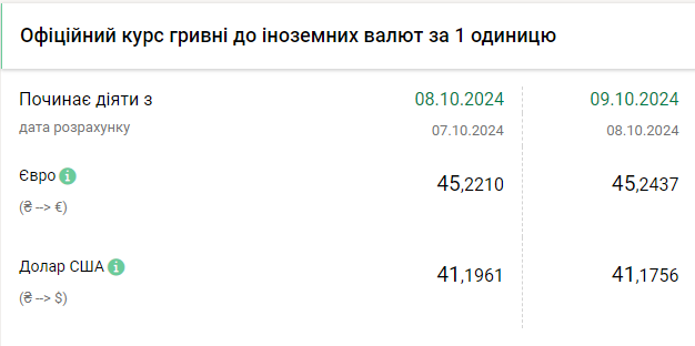 Офіційний курс на 9 жовтня 2024 року встановлено на такому рівні: 41,1756 грн. за 1 долар (-0,0205 грн).