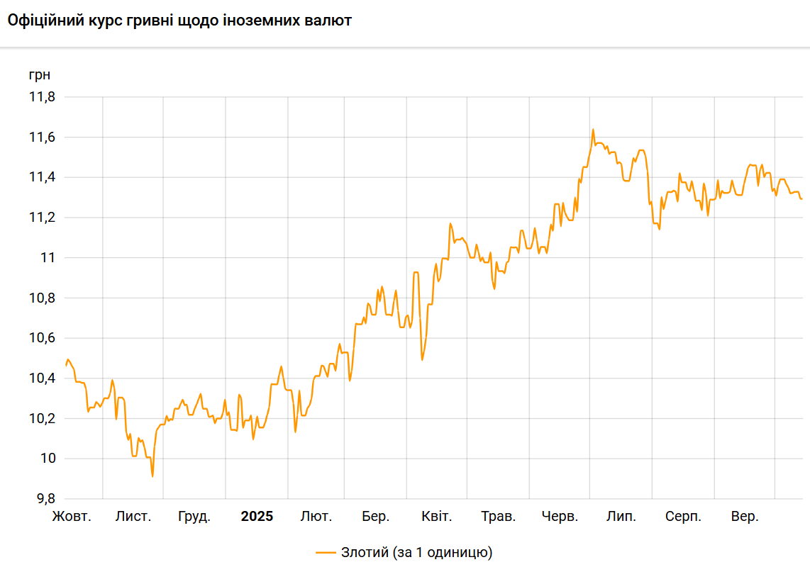 Офіційний курс на 14 жовтня 2025 року встановлено на такому рівні: 11,2945 гривень за 1 злотий (-0,0358 грн).