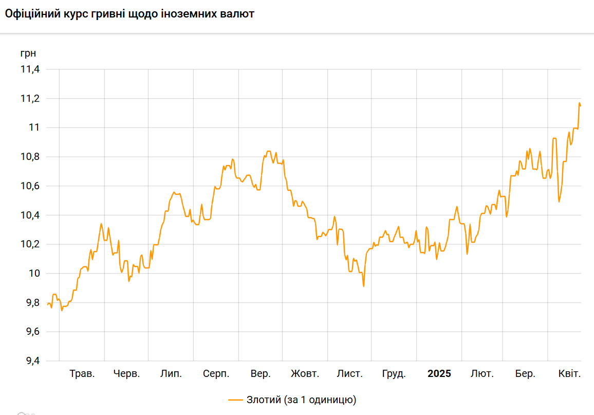 Офіційний курс на 23 квітня 2025 року встановлено на такому рівні: 11,148 гривень за 1 злотий (-0,0254 грн).