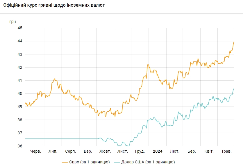 Офіційний курс на 29 травня 2024 року встановлено на такому рівні: 40,3958 грн за 1 долар (+0,0946 грн). Попередній максимум було зафіксовано день тому, 28 травня - 40,3012.