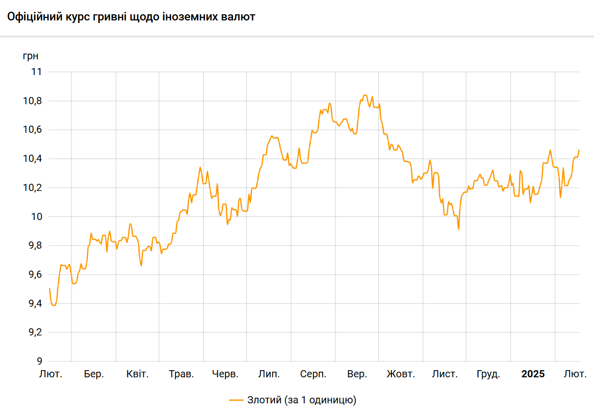Офіційний курс на 17 лютого 2025 року встановлено на такому рівні: 10,4661 гривень за 1 злотий (+0,0519 грн).