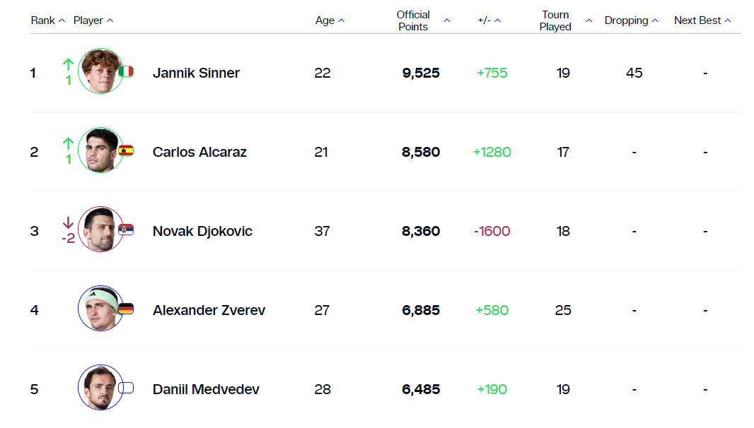 Зіннер набрав 9525 залікових балів і став лідером класифікації. Він на 945 пунктів випередив свого кривдника з Відкритого чемпіонату Франції. Алькарас, попри тріумф на паризькому ґрунті, зумів обійти лише серба Новака Джоковіча.
