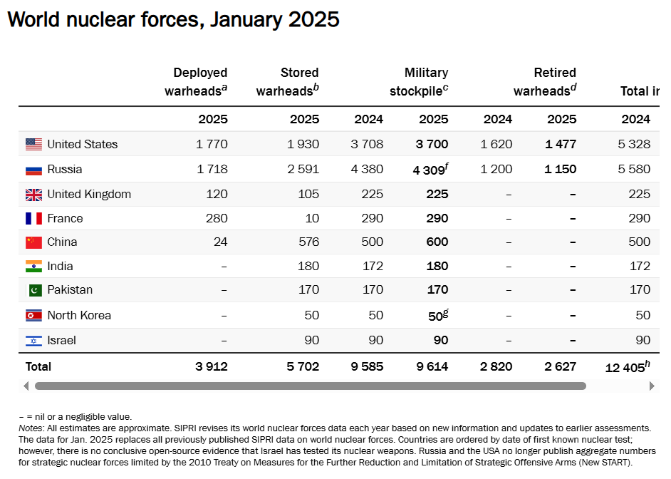 Росія і США володіють близько 90% всіх ядерних боєголовок. Їхні арсенали залишалися стабільними до 2024 року, проте обидві країни реалізують масштабні програми модернізації, які можуть призвести до зростання кількості та різноманітності озброєнь. У міру закінчення терміну дії договору СНО-III в лютому 2026 року, кількість розгорнутих стратегічних боєголовок може зрости.