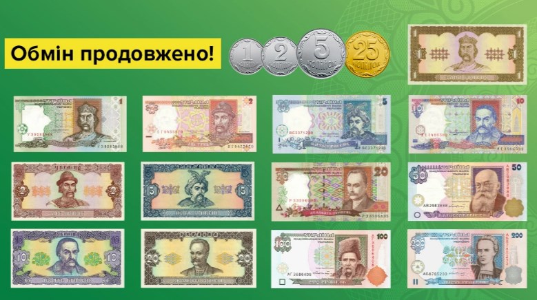 Обмін дрібних монет та старих банкнот гривні продовжили до кінця війни