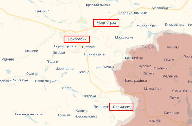 Покровськ – ще одне місто, над яким нависла загроза, але до нього росіянам ще потрібно пройти Селидове та Мирноград (фото deepstatemap.live)