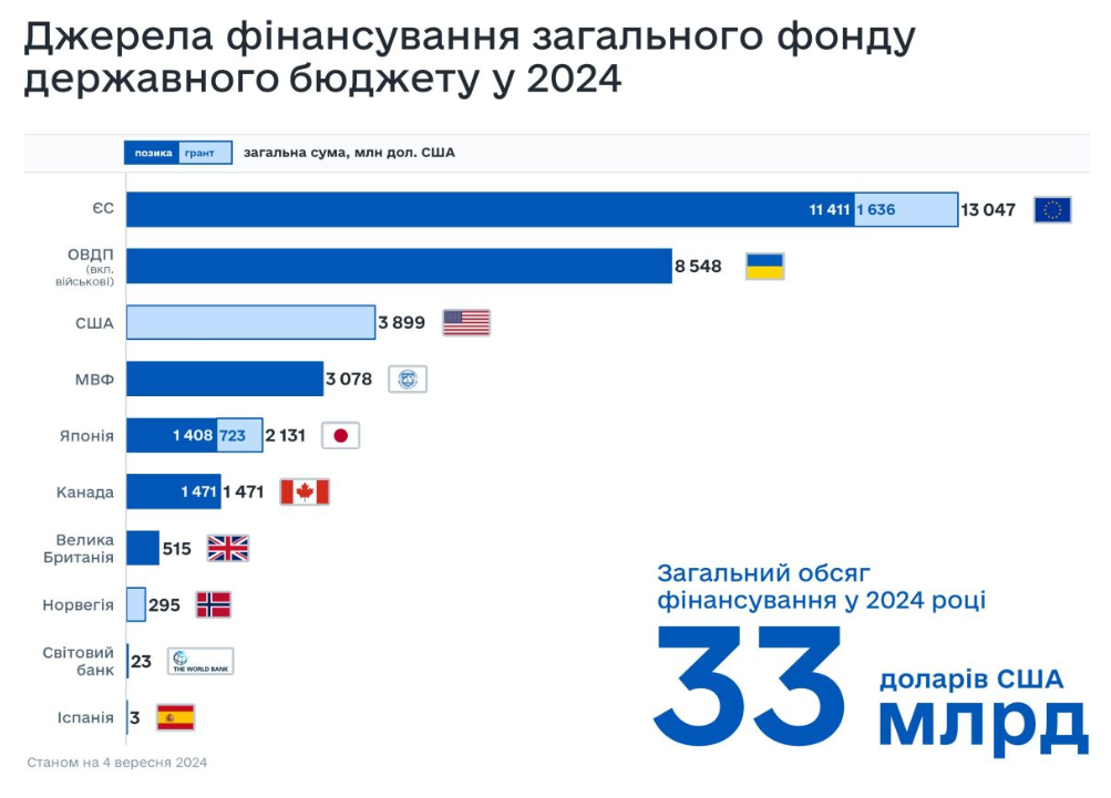 Обсяг фінансування загального фонду державного бюджету України в 2024 році, забезпеченого за рахунок розміщення військових облігацій, отримання кредитів від міжнародних фінансових організацій, а також двосторонніх кредитів та грантів, сягнув 33 млрд доларів (станом на 4 вересня).