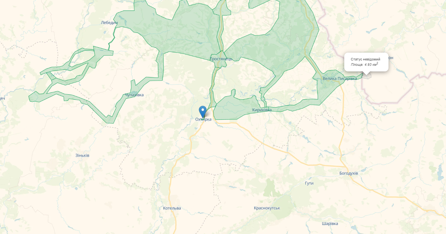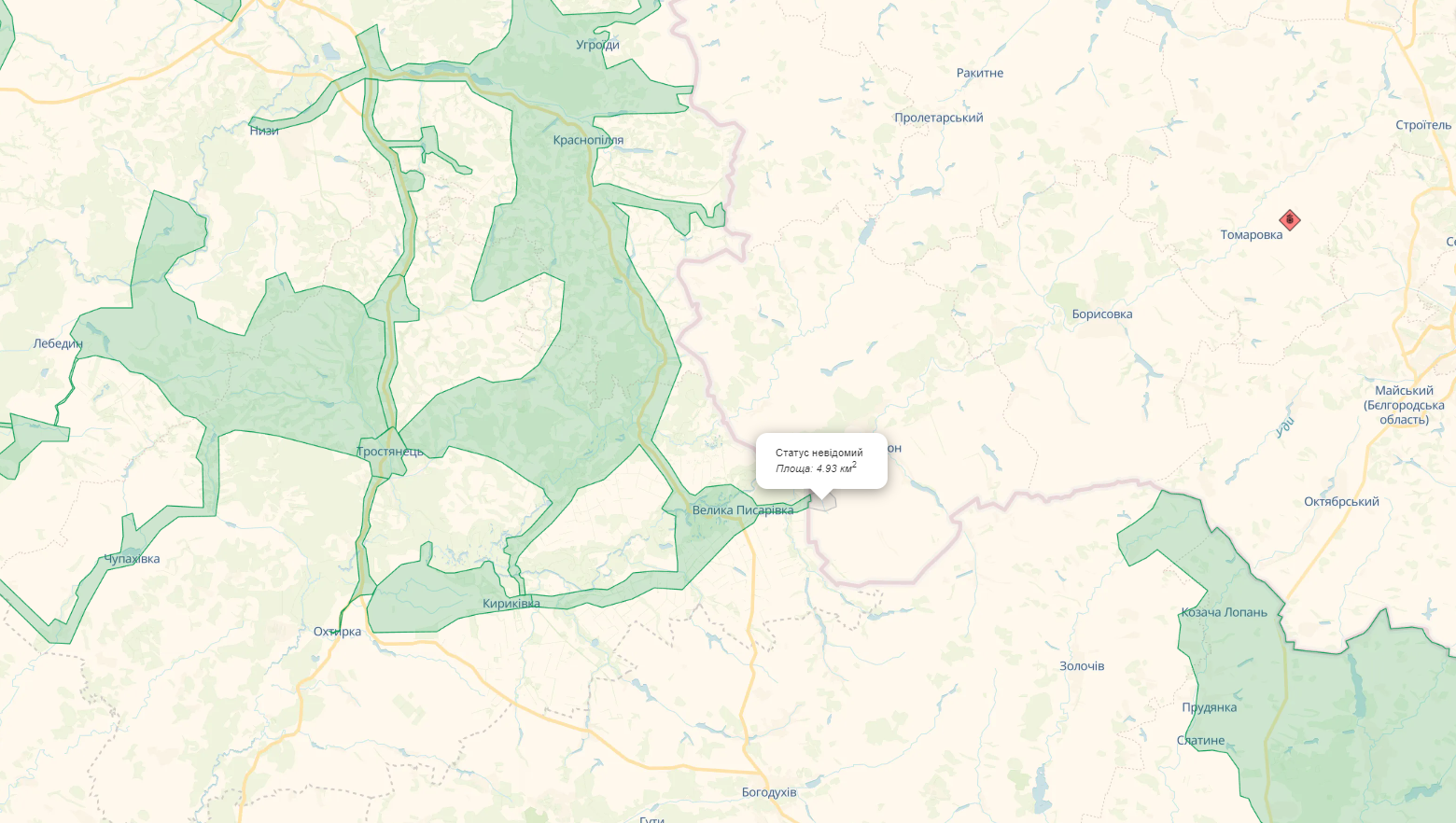 За даними карти, так звана "сіра зона" у Бєлгородській області зараз займає площу 4,93 квадратних кілометри.