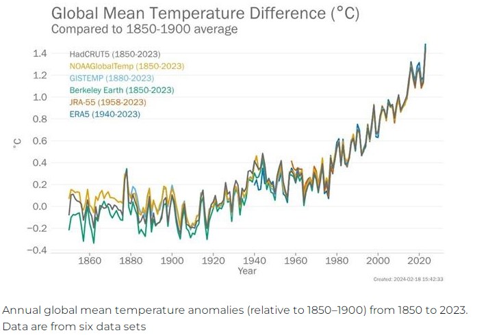 У доповіді ВМО підтверджується, що Глобальна середня приземна температура у 2023 році була приблизно на 1,45 градусів вище за середнє значення за 1850-1900 роки. 2023 став найтеплішим за всі 174 роки спостережень. Було побито рекорд попередніх найтепліших років: 2016 року, з температурою на 1,29 вище за середнє значення 1850-1900 років, і 2020 року, з перевищенням на 1,27 градусів.