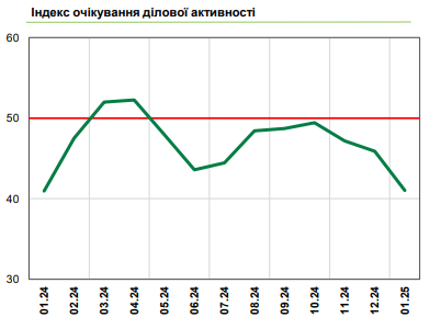 Як зазначили в НБУ, бізнес сезонно послабив оцінки щодо своєї поточної економічної діяльності. Індекс очікувань ділової активності (ІОДА) у січні 2025 року становив 41,0 (у грудні 2024 року - 45.9) та був на рівні січня 2024 року.