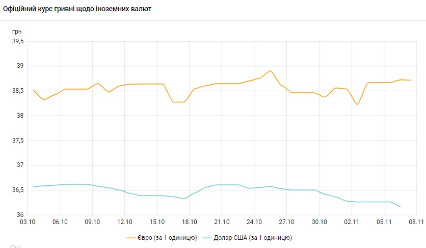 За даними НБУ, середній курс продажу готівкового долара в Україні в жовтні 2023 року знизився на 0,1% до 38,05 гривень. Долар подешевшав після трьох місяців зростання.