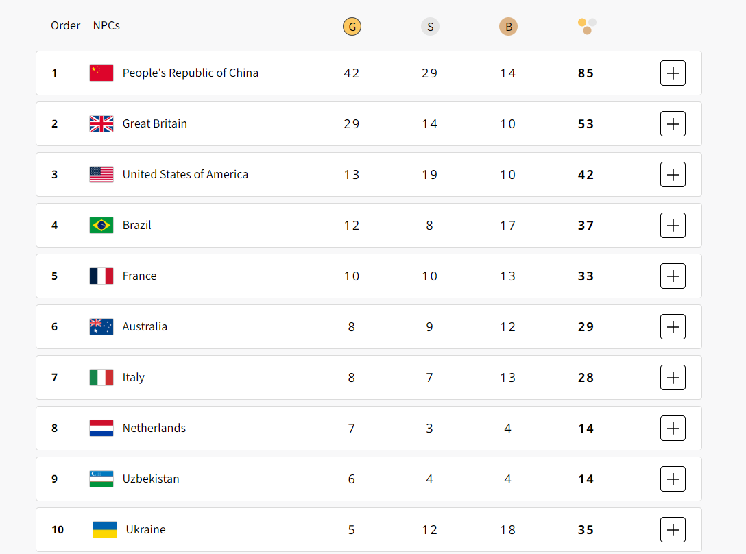 Збірна України піднялася на 10-те місце в загальному списку команд. Вітчизняні паралімпійці загалом завоювали 35 нагород, зокрема 5 золотих медалей. У лідерах загального заліку залишається Китай. Спортсмени з Піднебесної завоювали 42 золоті нагороди (85 загалом).