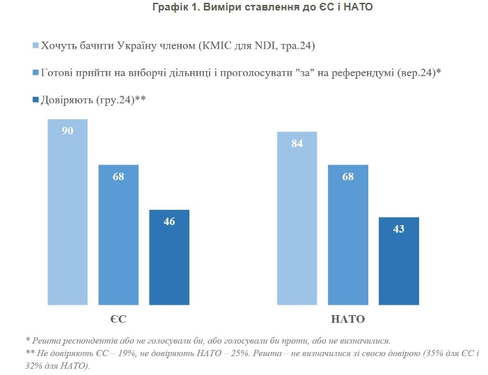 У разі проведення референдуму щодо вступу до ЄС 68% серед усіх українців готові прийти на виборчі дільниці і віддати голос "за". У разі проведення референдуму щодо НАТО - також 68%. Проголосували би проти - відповідно, 9% і 10%.