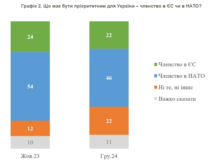 Соціологи також звертають увагу, що за останній рік стало більше тих, хто говорить, що не треба мати за пріоритет членство в жодному союзі (12% у жовтні 2023 року і 22% у грудні 2024 року). Водночас стало менше тих, хто говорить про членство в НАТО (54% раніше і 46% зараз) (для ЄС показники майже не змінилися).