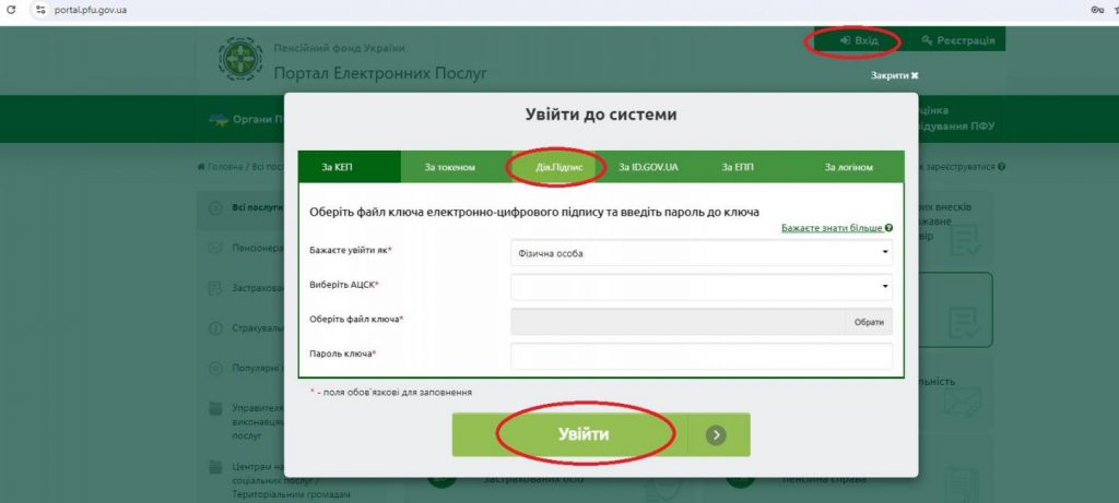 1. У правому верхньому куті натисніть кнопку "Вхід" та оберіть опцію увійти до системи через "Дія.Підпис".